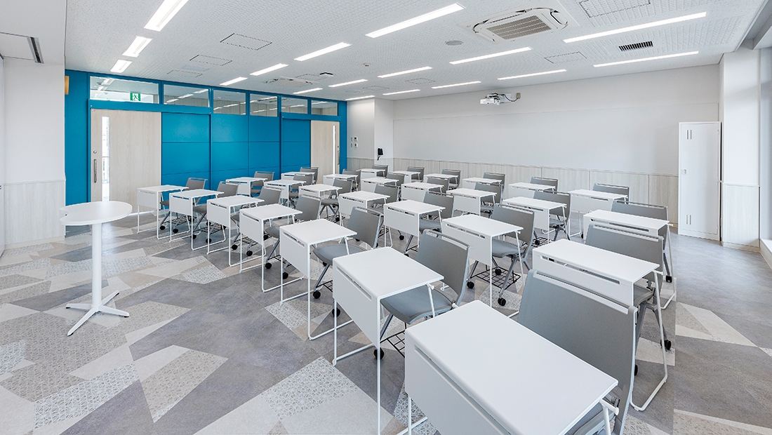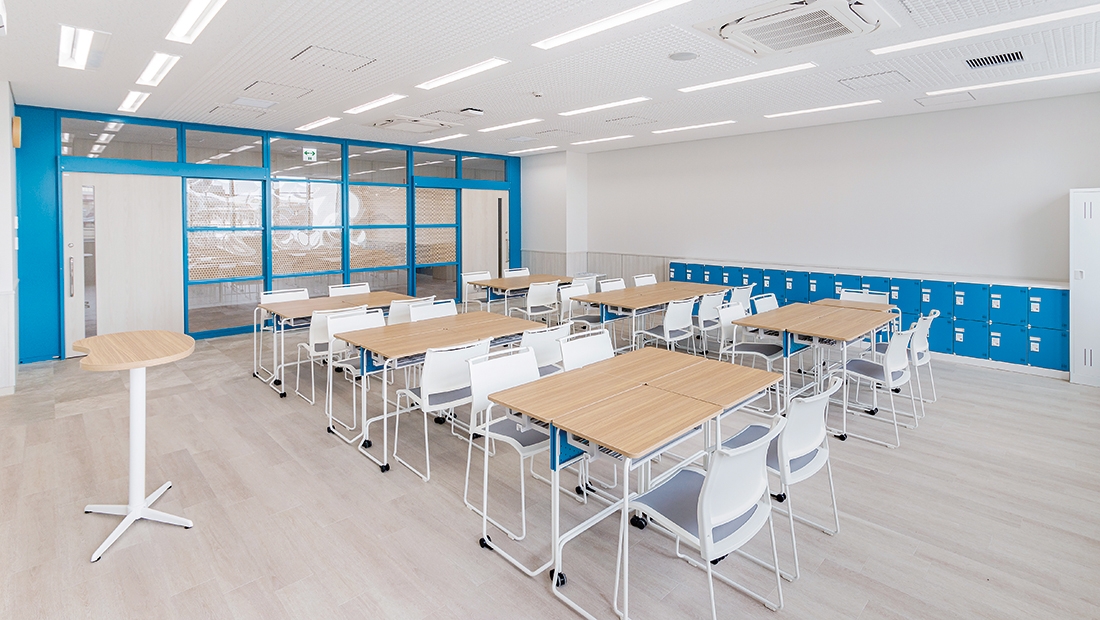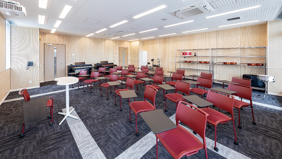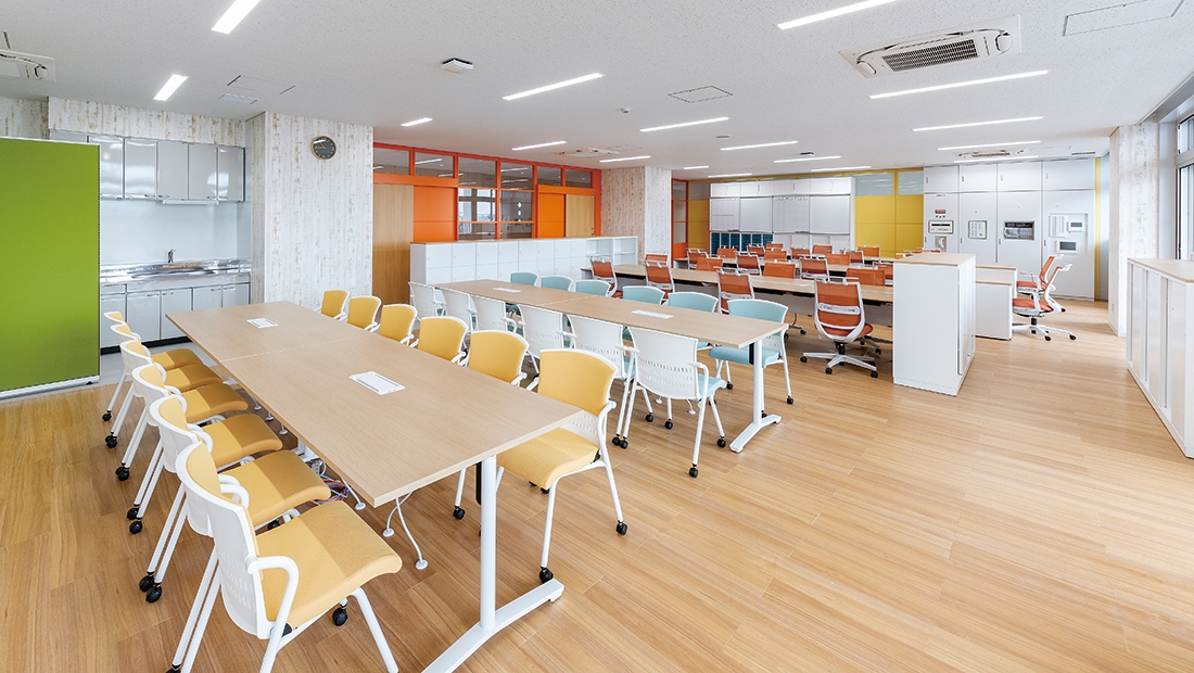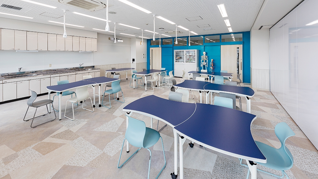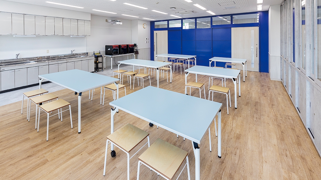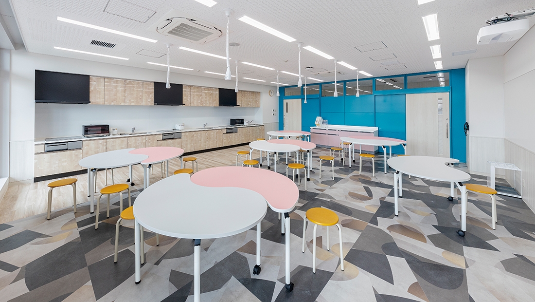 また、普通教室のほか、電子ドラムを入れた音楽室や、最新設備が整ったICT教室、家庭科教室、理科室、美術・技術室など、それぞれの教科の学びに合わせた教育環境が整備されており、通常の学校のイメージを払拭したフロアごとに統一された家具とカラーリングで、生徒の好奇心を刺激し、楽しく安心して学べる環境づくりがなされています。
