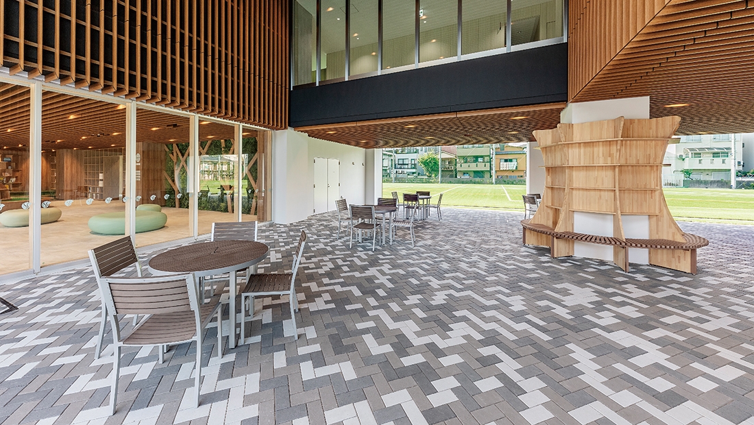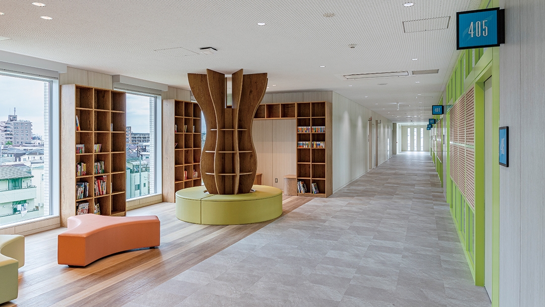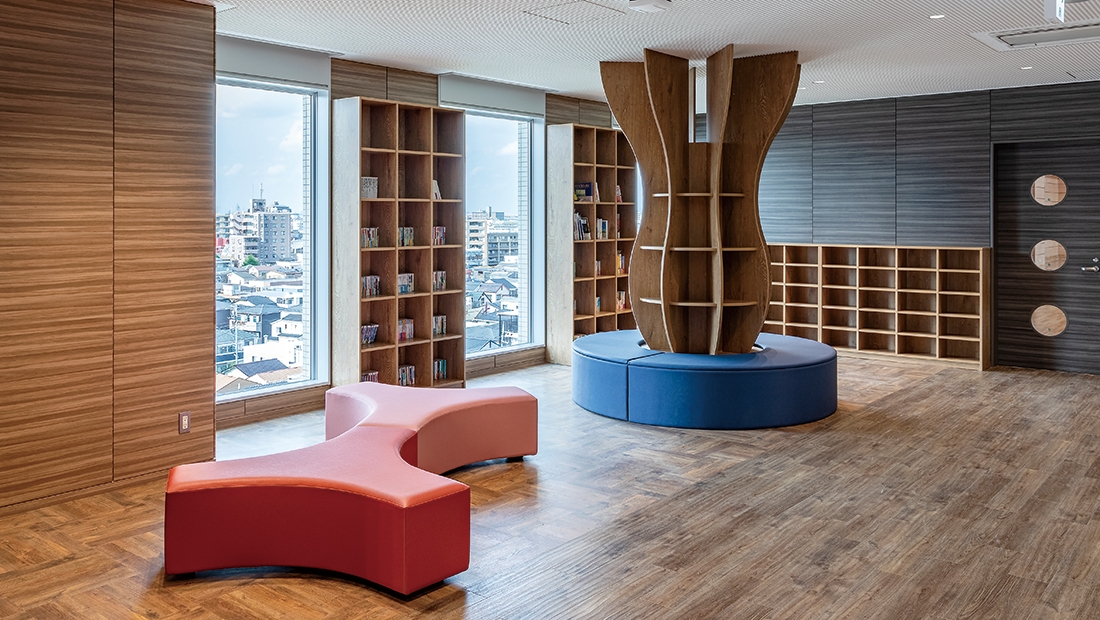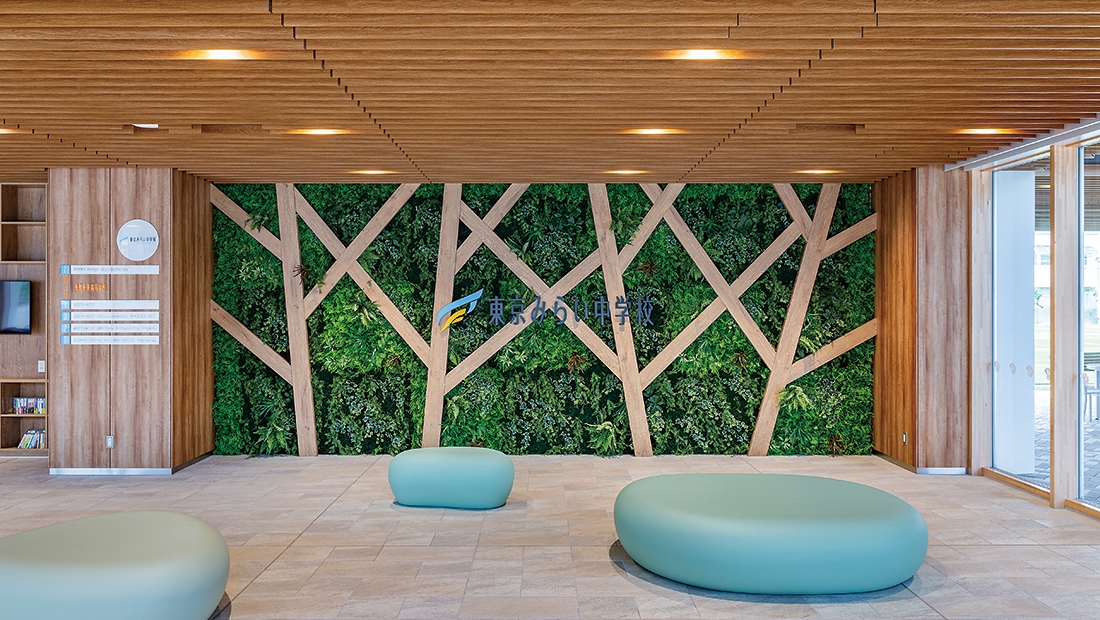 「東京みらい中学校」では、体育館をアクティブルーム、職員室をスタッフルームと呼ぶなど、「学校」のイメージはできるだけ避けており、1階のエントランスは森の中をイメージし、隣のライブラリーラウンジの壁面には天井まで届く本棚を設け、落ち着いた雰囲気の中で、時には寝転んで好きな本を読みたい時に読める空間にしています。