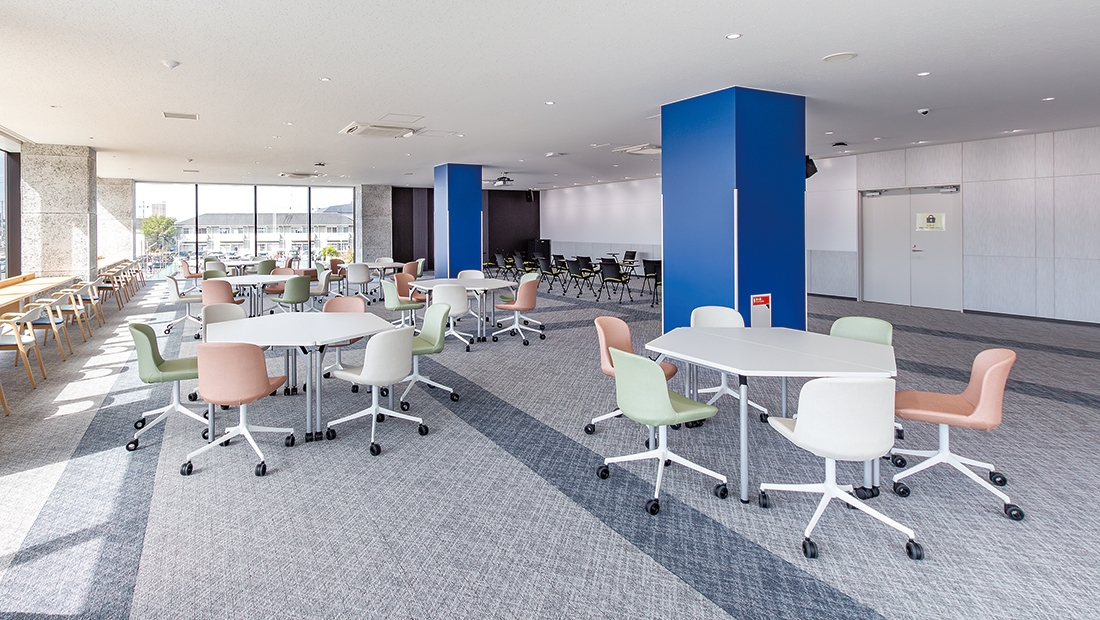 老朽化した既設部室棟から建て替えられた「学生会館 ACT Sta.(アクトス)」は、さまざまなキャンパス活動に利用される複合施設棟です。施設内には地域の方も利用可能なフリースペースも設けられており、クラブ活動の場だけでなく、地域の人々と触れ合い、学び、憩うことができる場となっています。