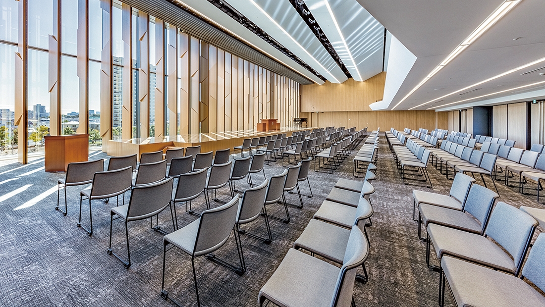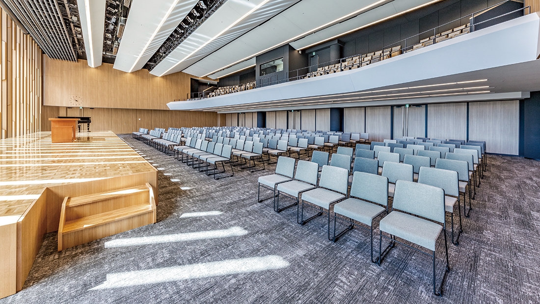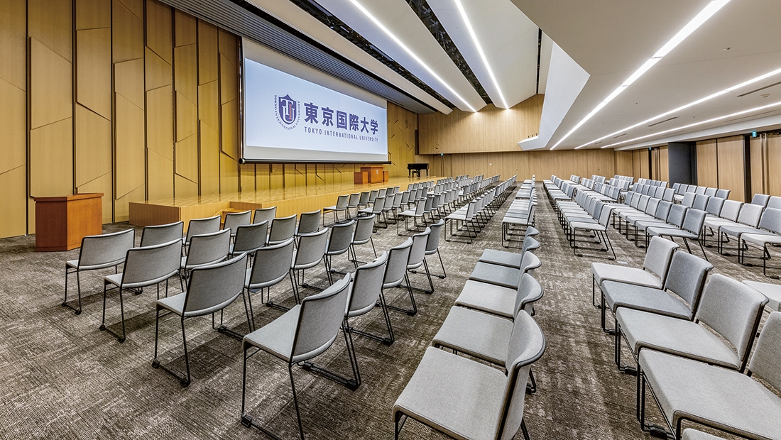 公園に面したガーデンウィングにある収容人数600名の「TIUホール」には、タブレットが装備されている固定イスのほか、タブレット装着可能な可動イスが採用されており、多目的に利用することができます。また、壁面には表裏それぞれの面に吸音と反射の機能を持った木調パネルの回転ルーバーが採用されており、催しの内容に応じて開閉することができます。