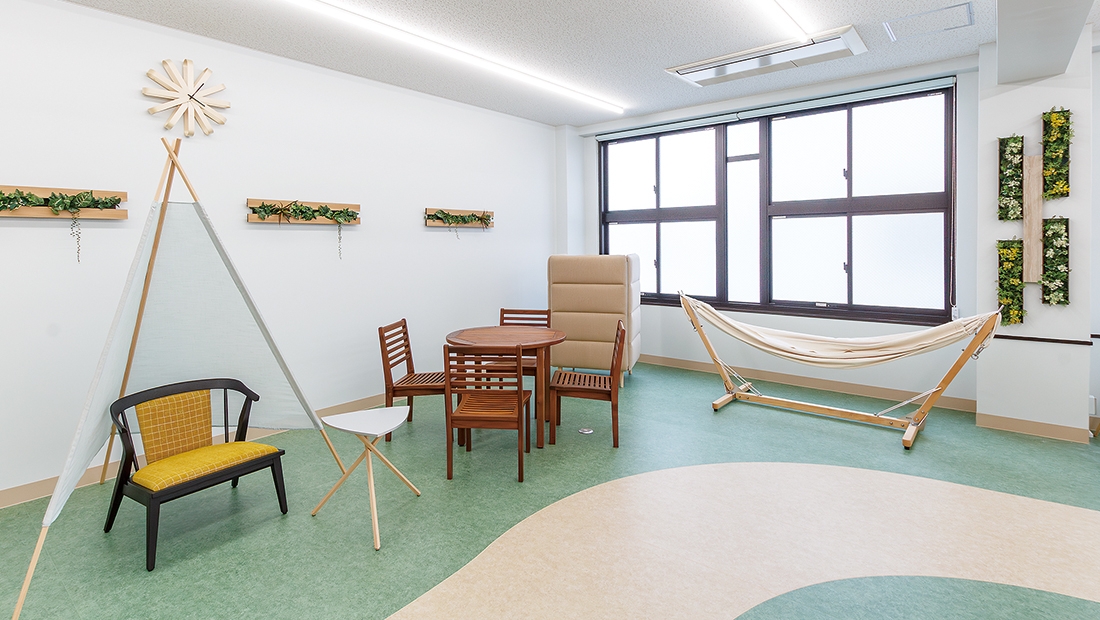 ミルトスコース教室/イス:ティーポ特注品ほか、テーブル:DT-15Rほか、サイドテーブル、パネル付ソファ、ハンモックチェア、ハンモック、タープ、シェルフ、ホワイトボード、壁面ホワイトボード、内装改修(天井、照明、壁、壁面装飾、ロールスクリーン、建具、床)