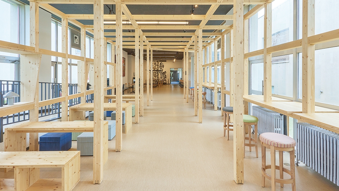 これまで活用されていなかった空間は、壁や天井の塗替え、木のトンネルの設置により、明るく温もりのある空間へと生まれ変わりました。交流スペースには、カフェ風のカウンター席やソファ席、移動式カフェワゴンが設置され、学生や教員だけでなく、地域の人々の交流の場として期待されています。