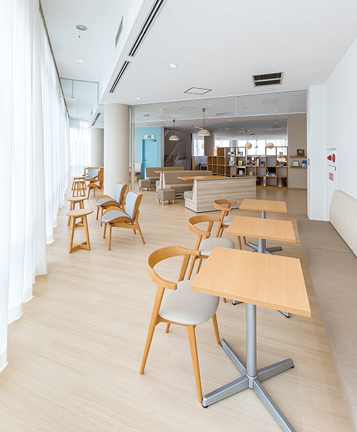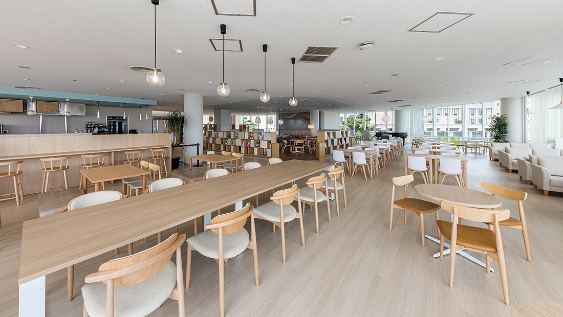 学生からの「おしゃれなカフェをつくってほしい」という要望を受け完成したカフェは、書架に囲まれ、本を読みながら飲食できる「ブックカフェエリア」や、大人数で座れる席やゆったりくつろげるソファ席を配置し、仲間同士で会話を楽しんだり、イベントにも活用できる「コミュニケーションエリア」など、「学び、交流し、考える」のコンセプトに基づいたゾーニングがなされています。