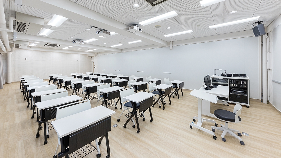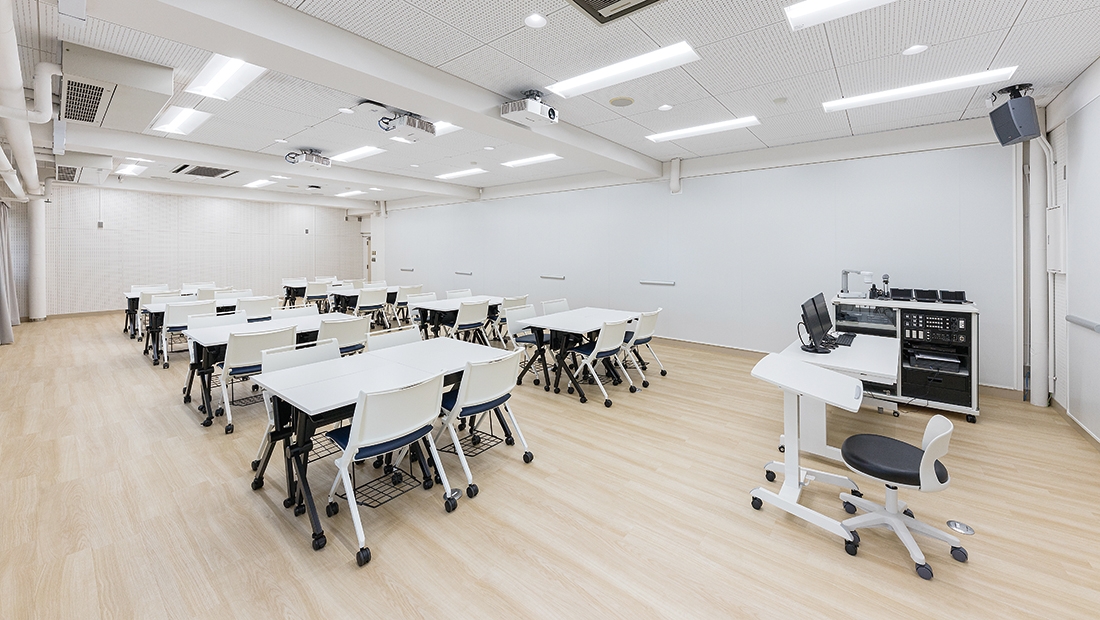 3号館 2階 324教室 ここラボ1/イス:ティーポ、デスク:フリプト、平デスク、教師用イス:NR-CAW、教卓、壁面ホワイトボード、開閉式ペントレイ、AV設備、内装改修(壁、床、建具硬質塩ビシート貼り)