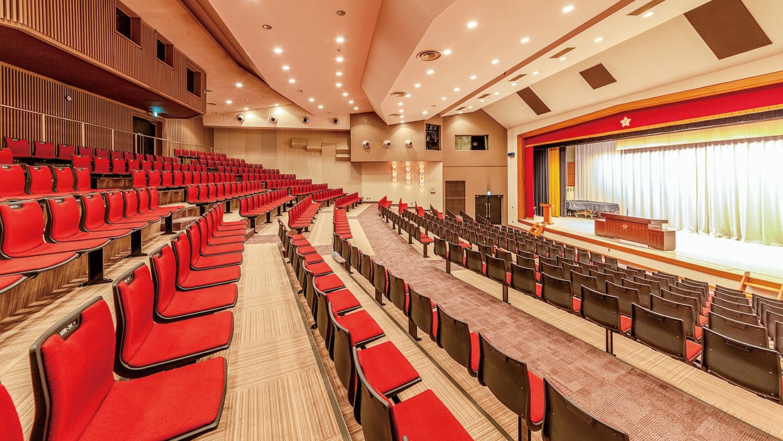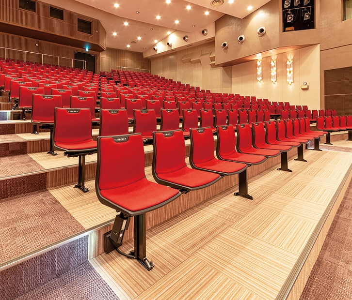 496名収容可能なプライマスメモリアルホールは、イベントや学校説明会など、さまざな用途で利用されています。入替えられた客席は、既存の客席の意匠を踏襲しながらも、背座パッド付きのイスが採用されており、より快適に聴講できるホールへと生まれ変わりました。