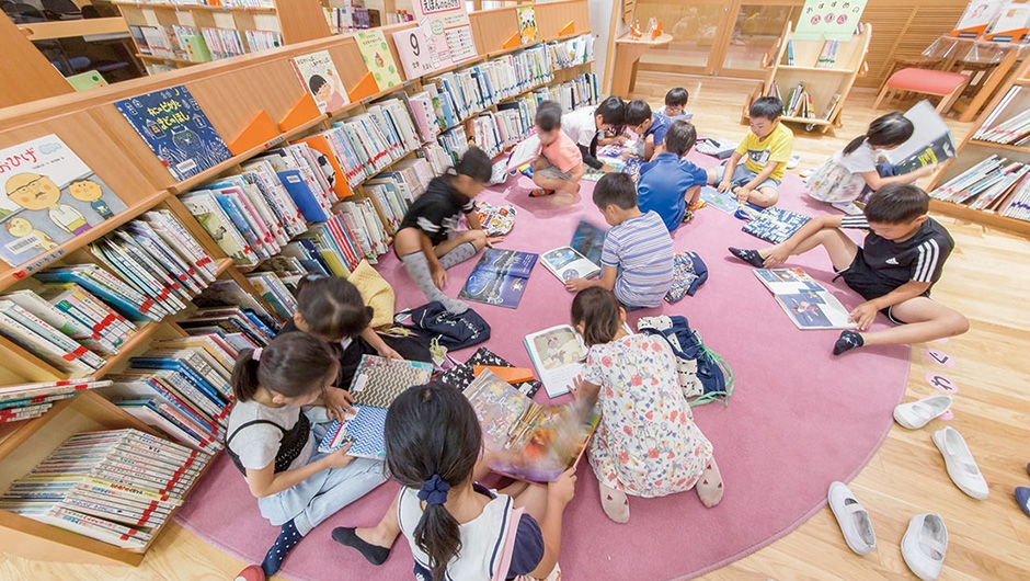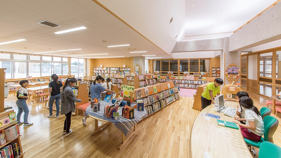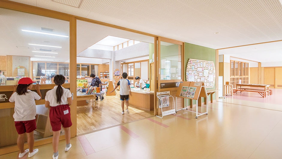 亀山市立川崎小学校では、建物の老朽化により防災面や安全面に課題を抱えていたことから、旧校舎を取り壊し新校舎を建設。新校舎内には、図書室とPC教室を備えた「メディアセンター」や、地域住民らが気軽に立ち寄り学習支援ができる「ふれあい活動室」が設置されています。亀山市は学校図書館支援事業を市の主要事業と位置づけ、図書活動を推進しており、メディアセンターは児童が普段から行き来するコミュニティーモールに面している校舎2階の中心に設置され、多くの児童に利用される図書室へと生まれ変わっています。