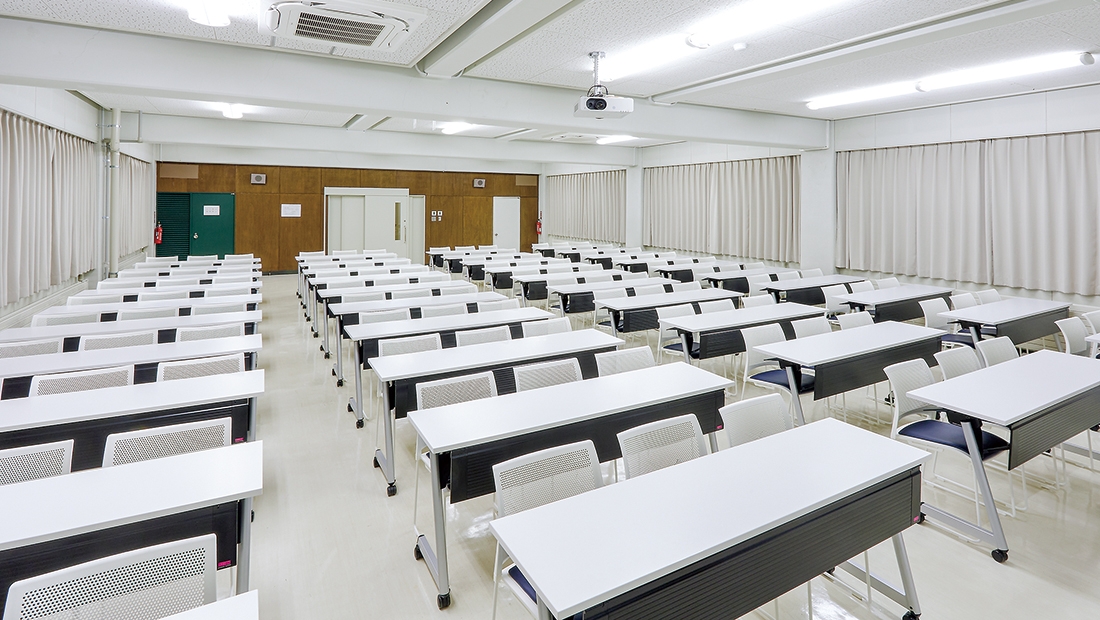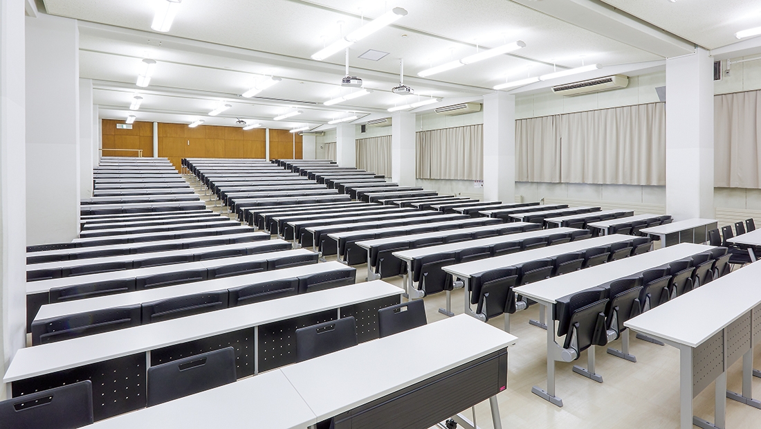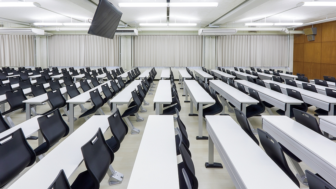 3号棟332教室の固定席は、これまでの木目基調から黒と白を基調としたイス・テーブルに入替えられたことにより、明るくモダンな空間へと生まれ変わりました。また、3号棟322教室の固定席は、前方通路タイプから後方通路タイプへと変更され、教室内のスムーズな移動が可能となったほか、移動席の各教室では、移動性と収納性が高いイス・テーブルが採用されており、フレキシブルにレイアウト変更ができるようになっています。