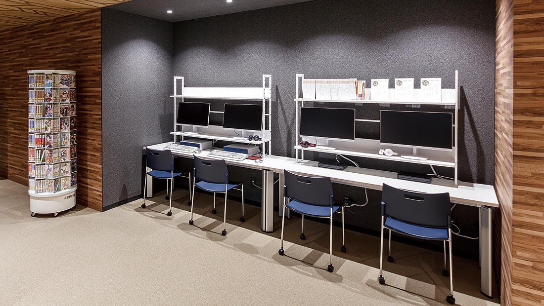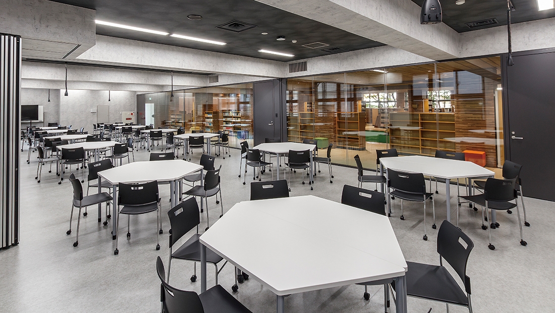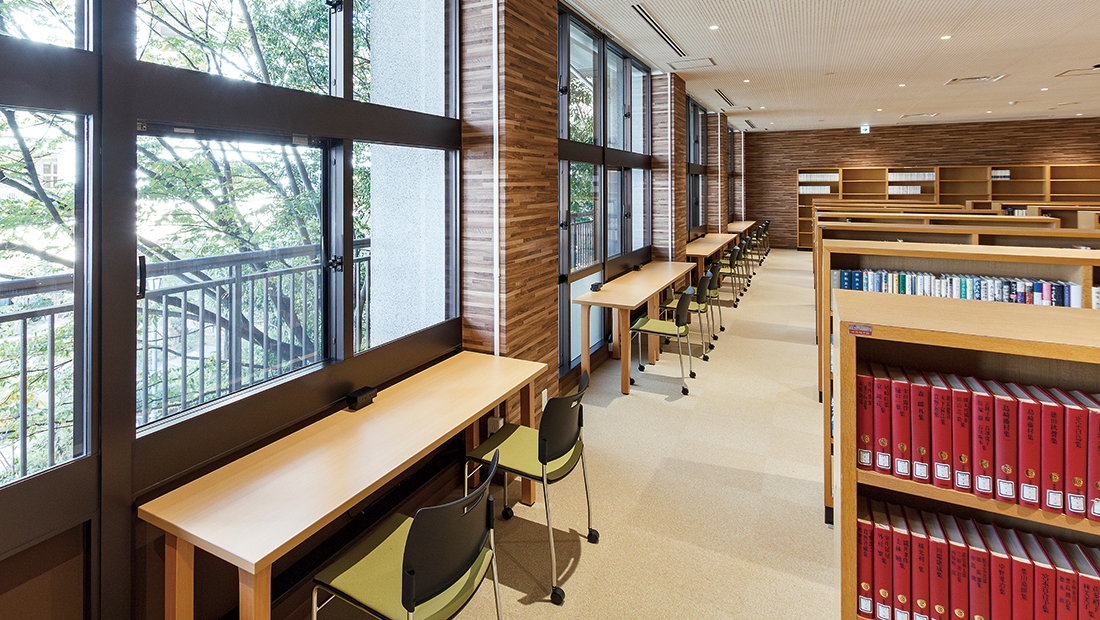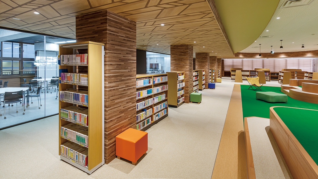木を基調とした内装で温もりに溢れ、低い書架で見通しの良い開放感のある空間となった図書館には、中央に芝生広場のような「リラックススペース」が設けられたほか、読書や自習に集中できるスペースや多彩なメディアコンテンツを活用できるコーナーが設置されています。また、隣接して「アクティブラーニング」を実践する場として「ラーニングコモンズ」が設置されています。