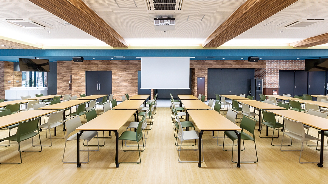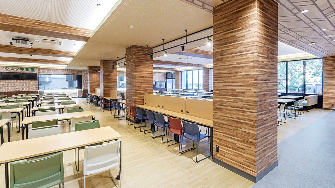 さまざまな交流の場として、内外の学園関係者の利用も想定してリニューアルされた食堂には、カウンター席やファミリーレストランのようなソファ席、中庭の若草庭園を望むテラス席など、用途に合わせて選べる多様な席が設置されています。