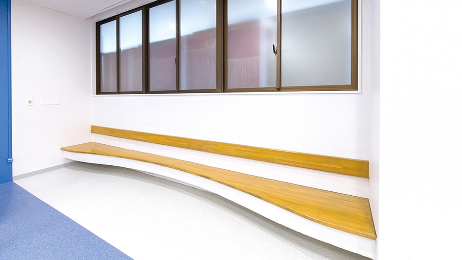 生徒ホール/イス:プロ、テーブル:DTN、内装改修(床、壁、照明、ショーケース)、一部移設家具