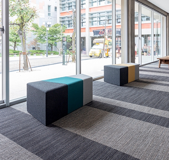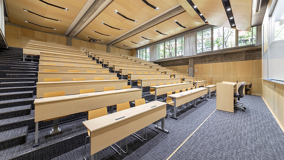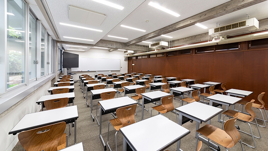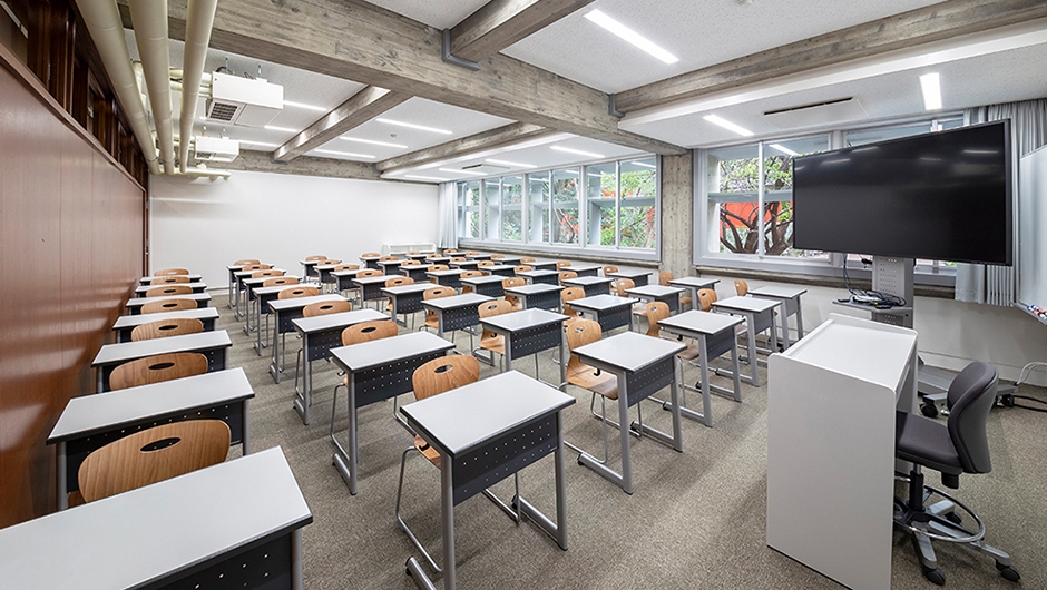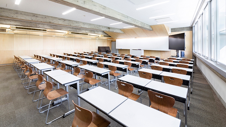 G棟 教室/講義デスク・イス:SCF-5105特注品、移動イス:SCM-5105-C、移動デスク特注品 固定席 197席・移動席9席 総席数206席、教師用イス、ホワイトボード、教壇