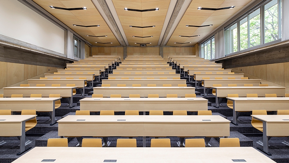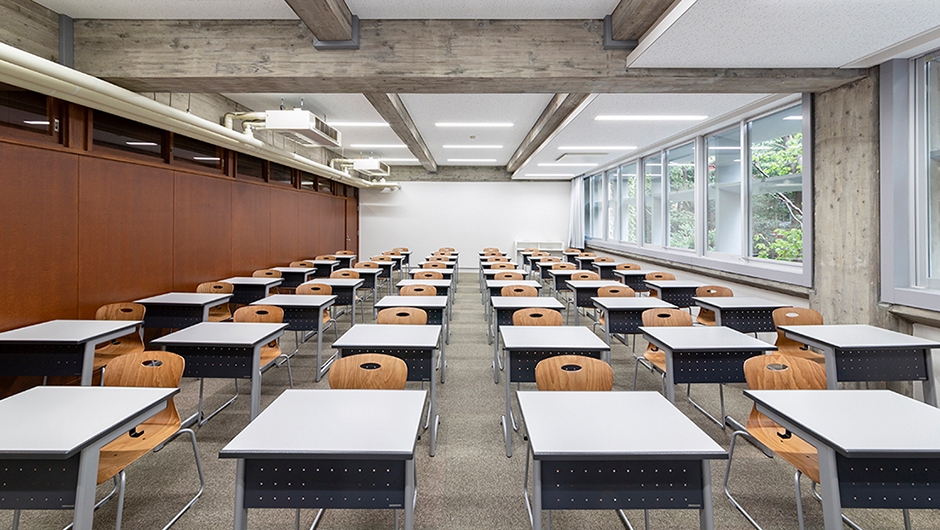プロジェクトでは、レーモンド氏の意匠を維持する外装改修とともに、既存教室の改修や学生のためのセミナー室整備に加え、安全性・利便性向上のためのグラウンド人工芝整備やキャンパス内動線の整備、セキュリティー強化やユニバーサル化にも取り組んでおり、2021年度中の完成を目指しています。