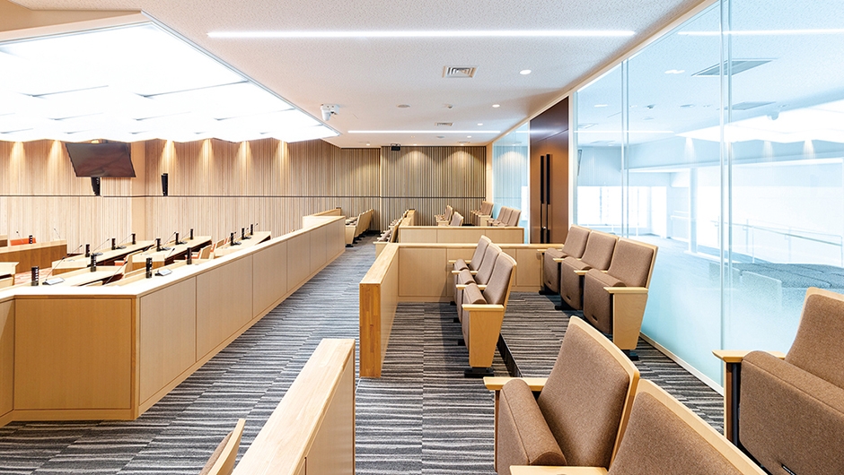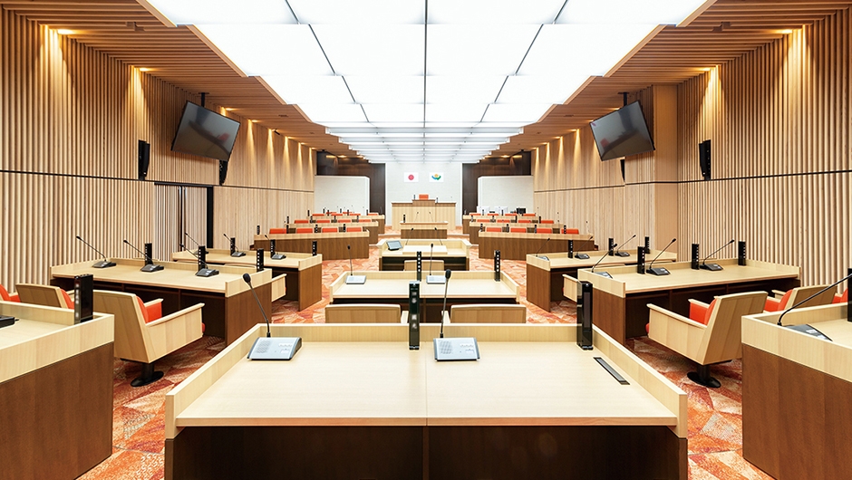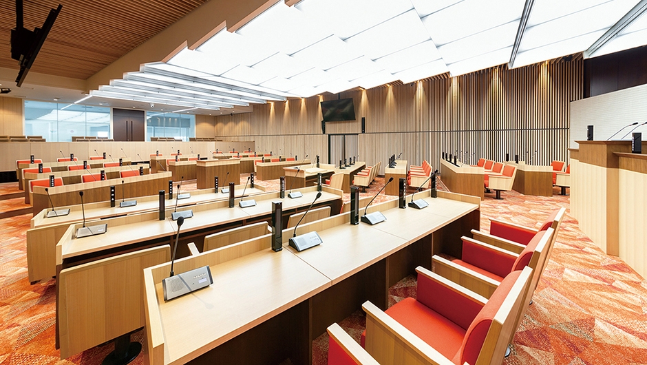 新庁舎6階に配置された議場では、車椅子用の傍聴スペースとともに難聴支援に適した補聴システムが導入され、ユニバーサルデザインに配慮した議場となっています。